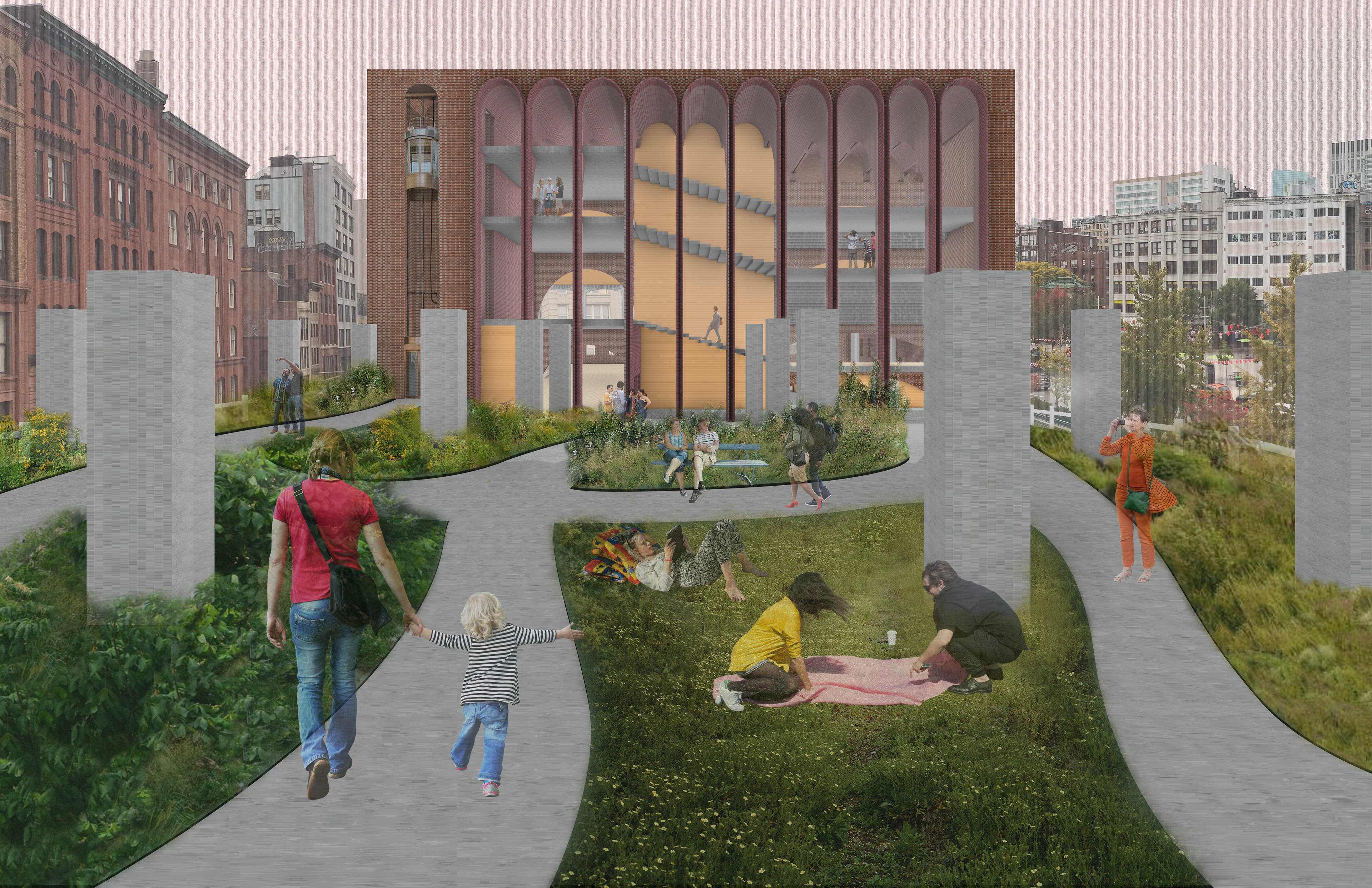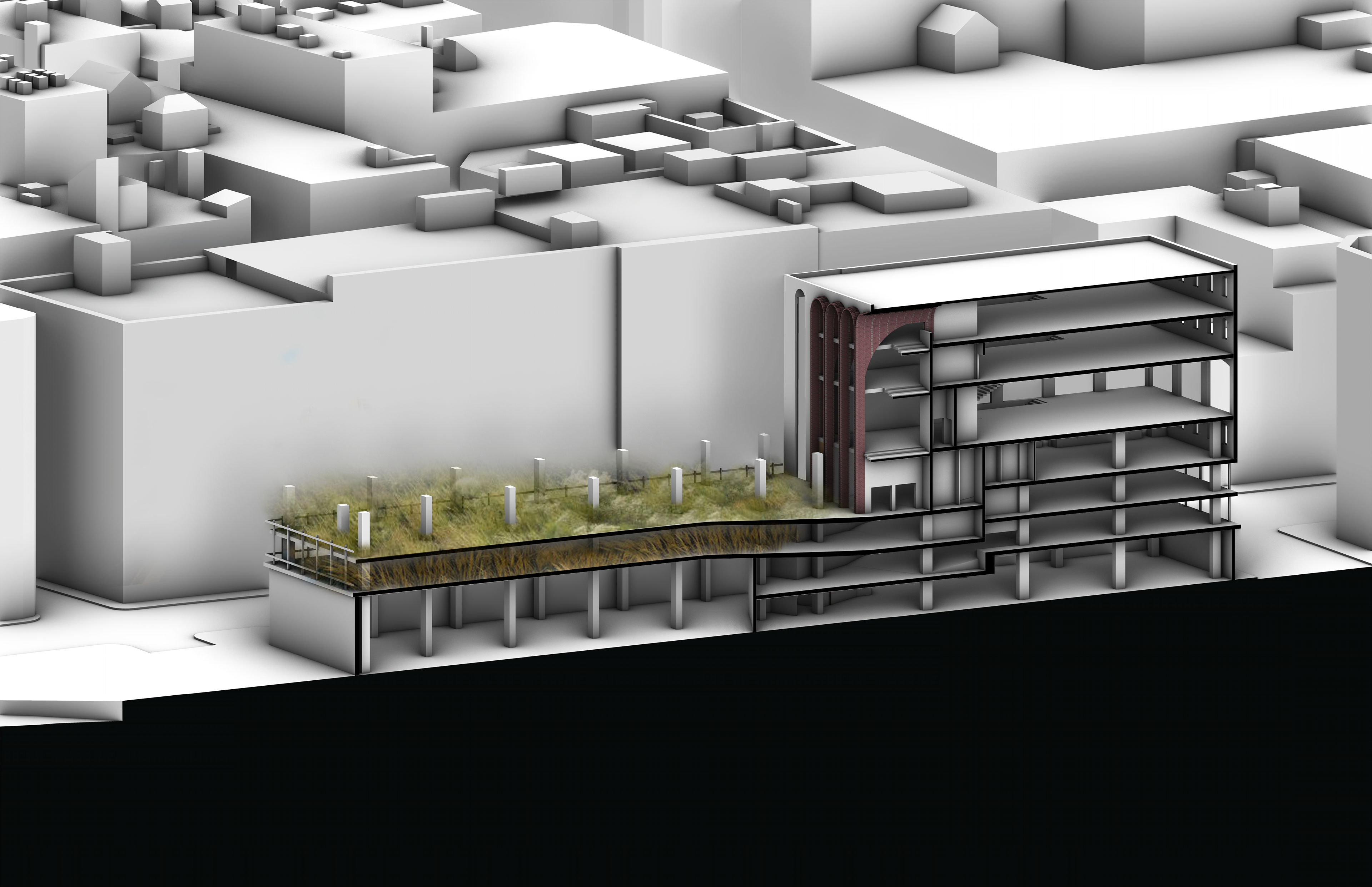 On the ground level, bustling storefronts and restaurants remain untouched through an adaptive reuse of the abandoned parking garage ramps. Removing the roof, half of the garage is exposed to the open side of the site on the Greenway while the Library is built onto the other, quieter half nearest the denser Leather District.