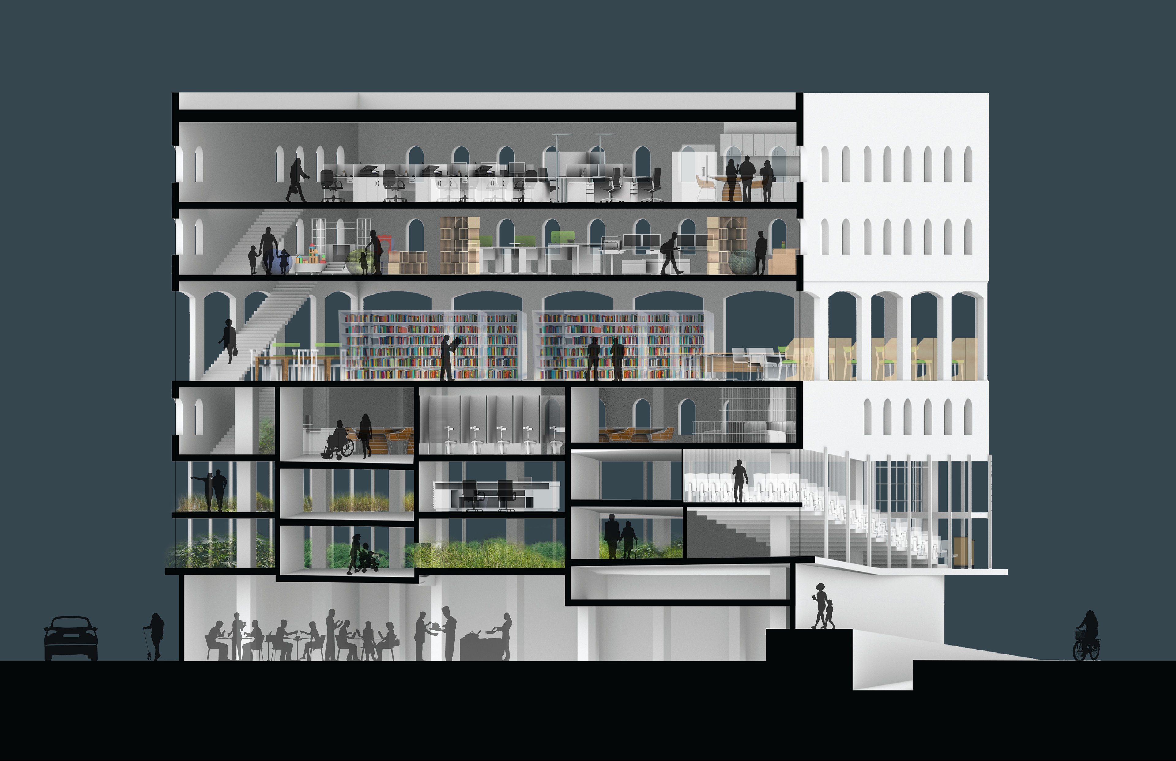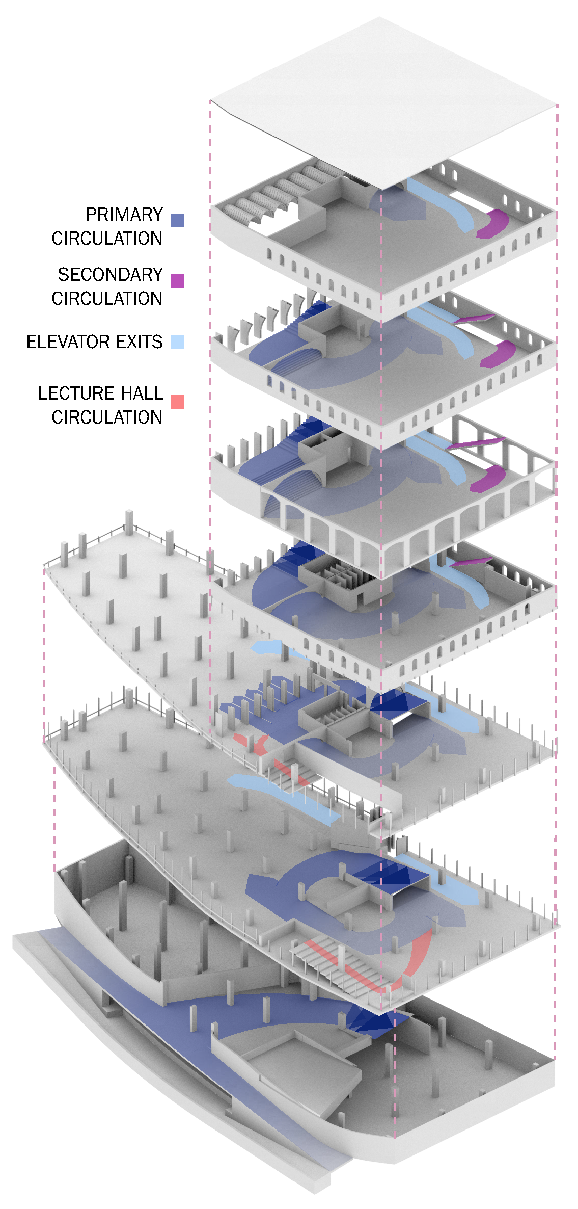 The bottom floors of the library remain partially open with revolving windows, serving as adaptable community green spaces. As the ramp level increases, the building becomes more fully enclosed. Circulation follows the circular ramp form and is stepped back to act as the interaction zone overlooking the green space.