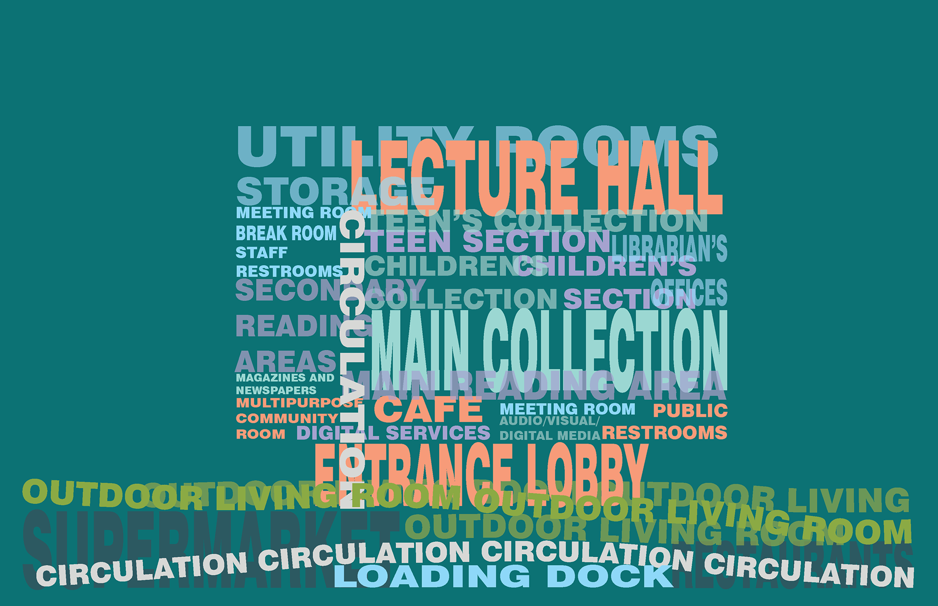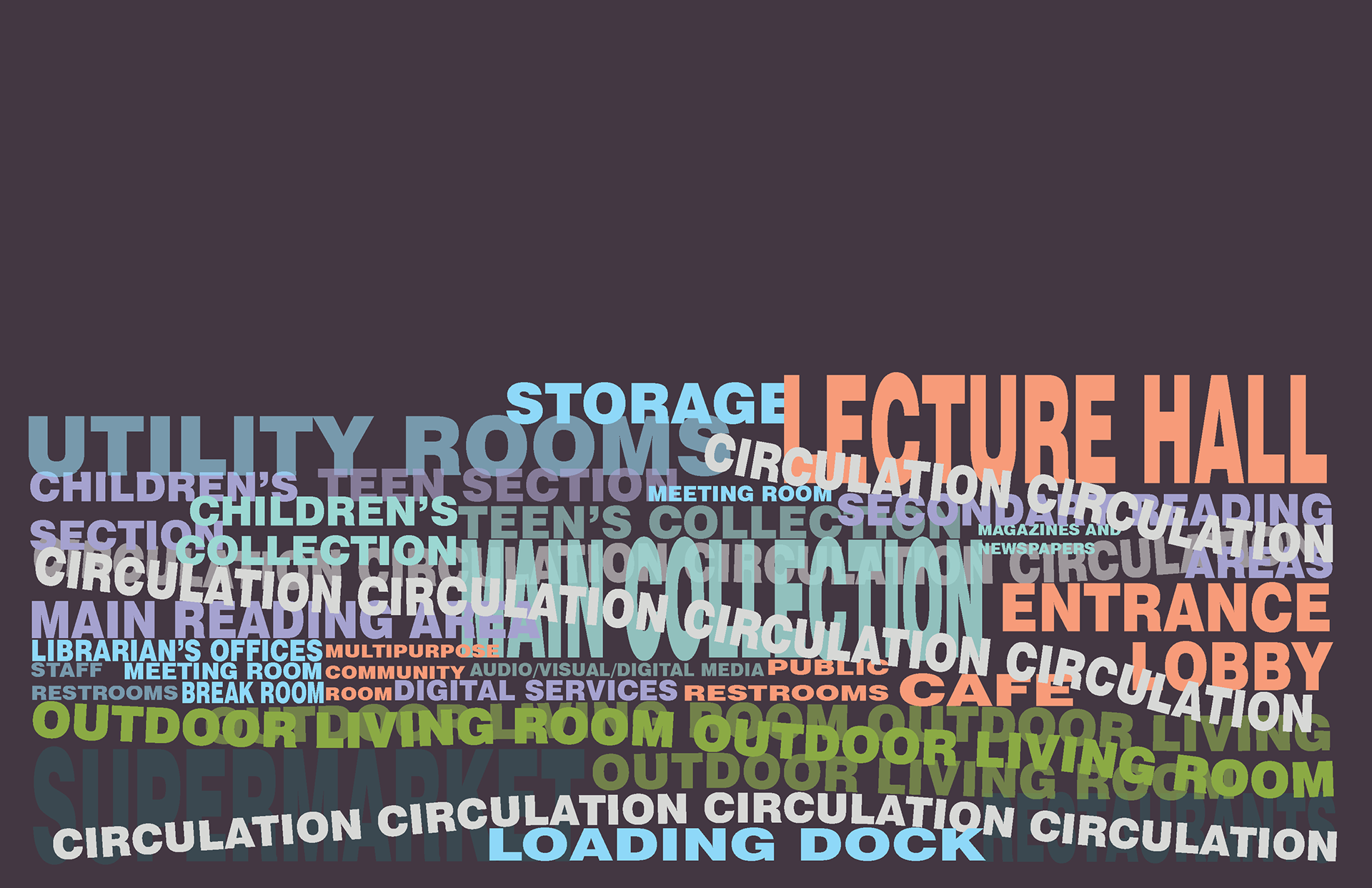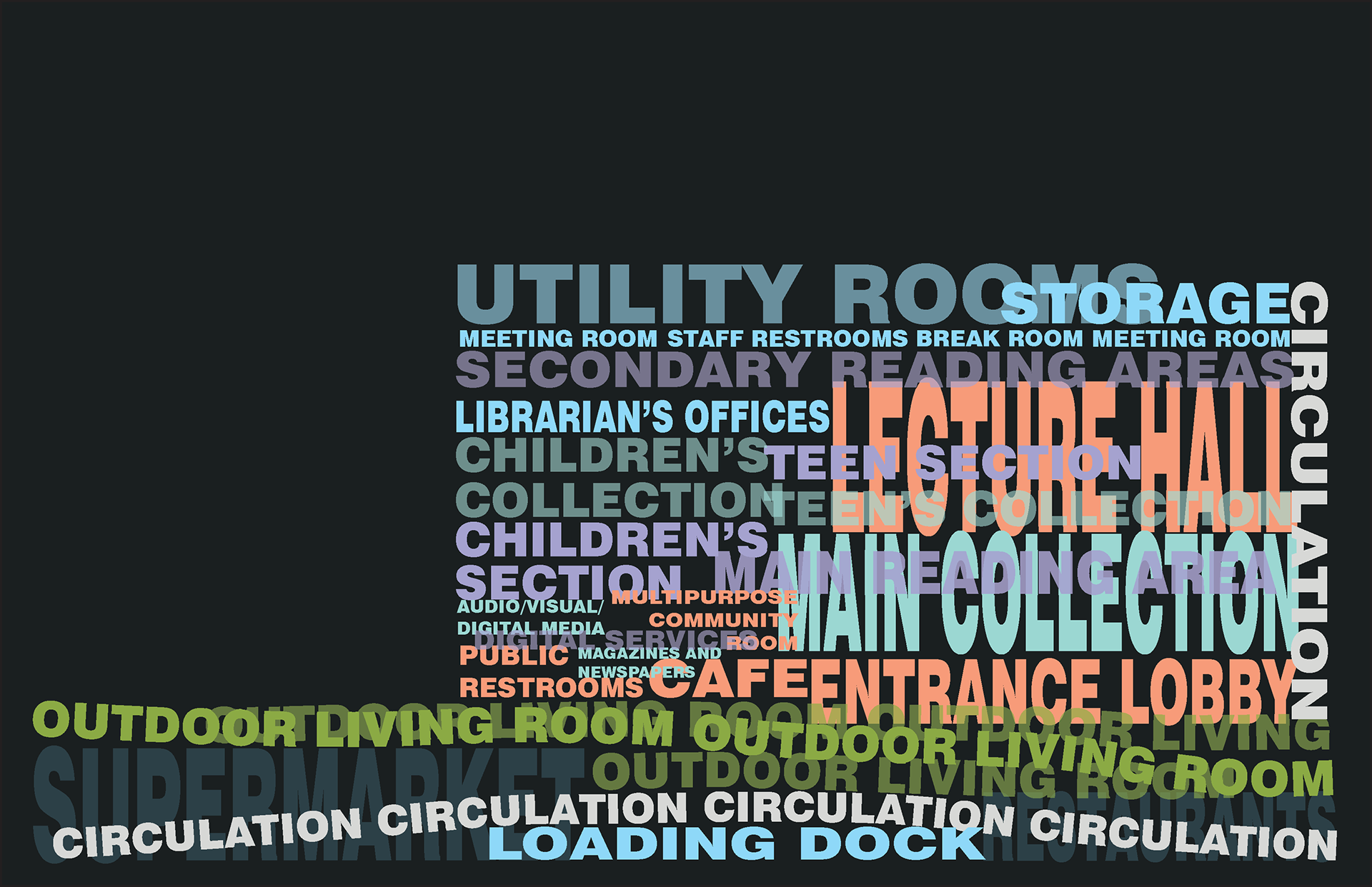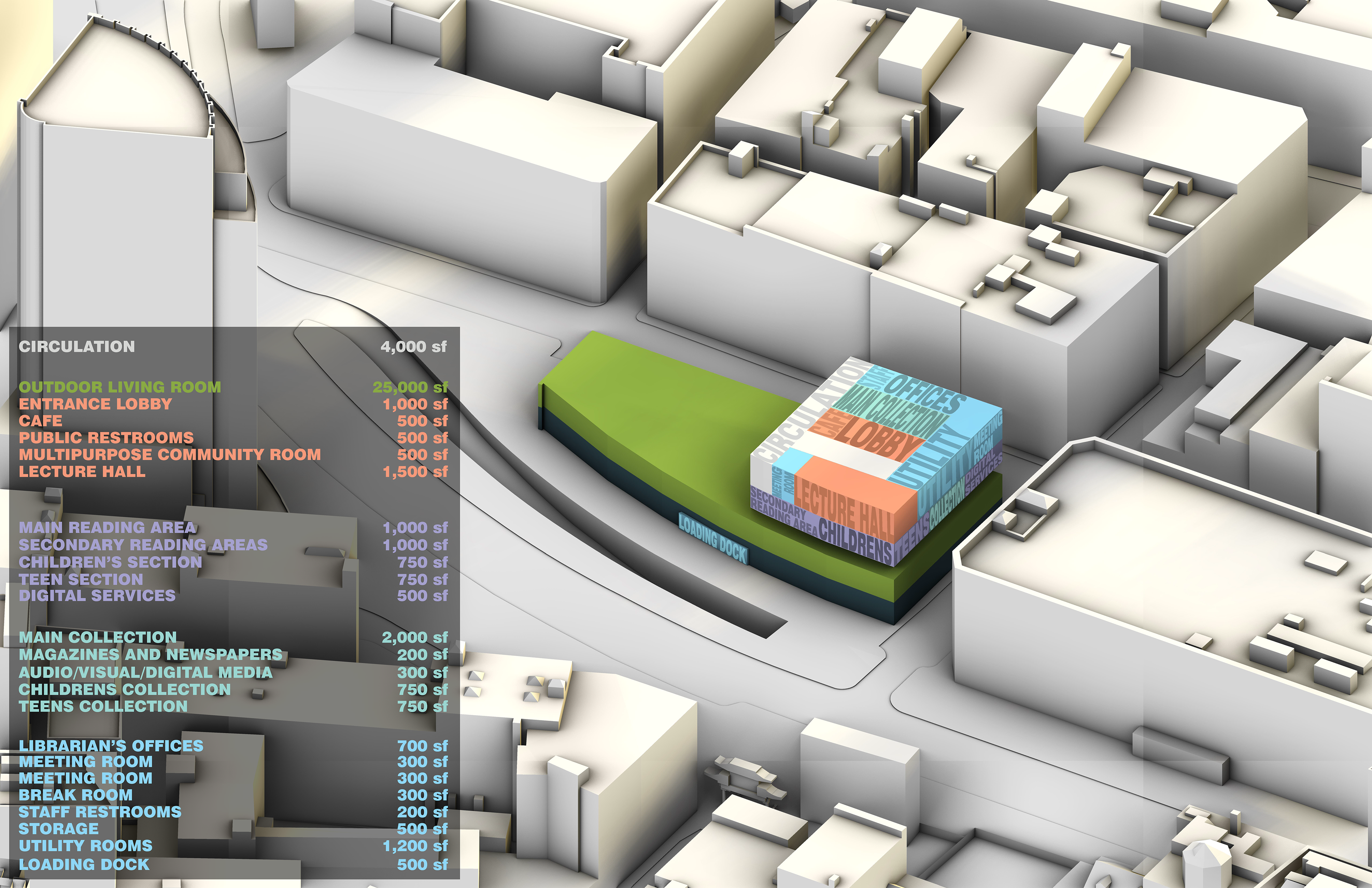 Studying the programmatic elements of the library and how they might be composed on the site, word diagrams were helpful in organizing the library's location, form, and function in relation to the public green space. Additionally, circulation was tested in multiple ways, leading to the realization of using the primary circulation as a means for the interaction zone.