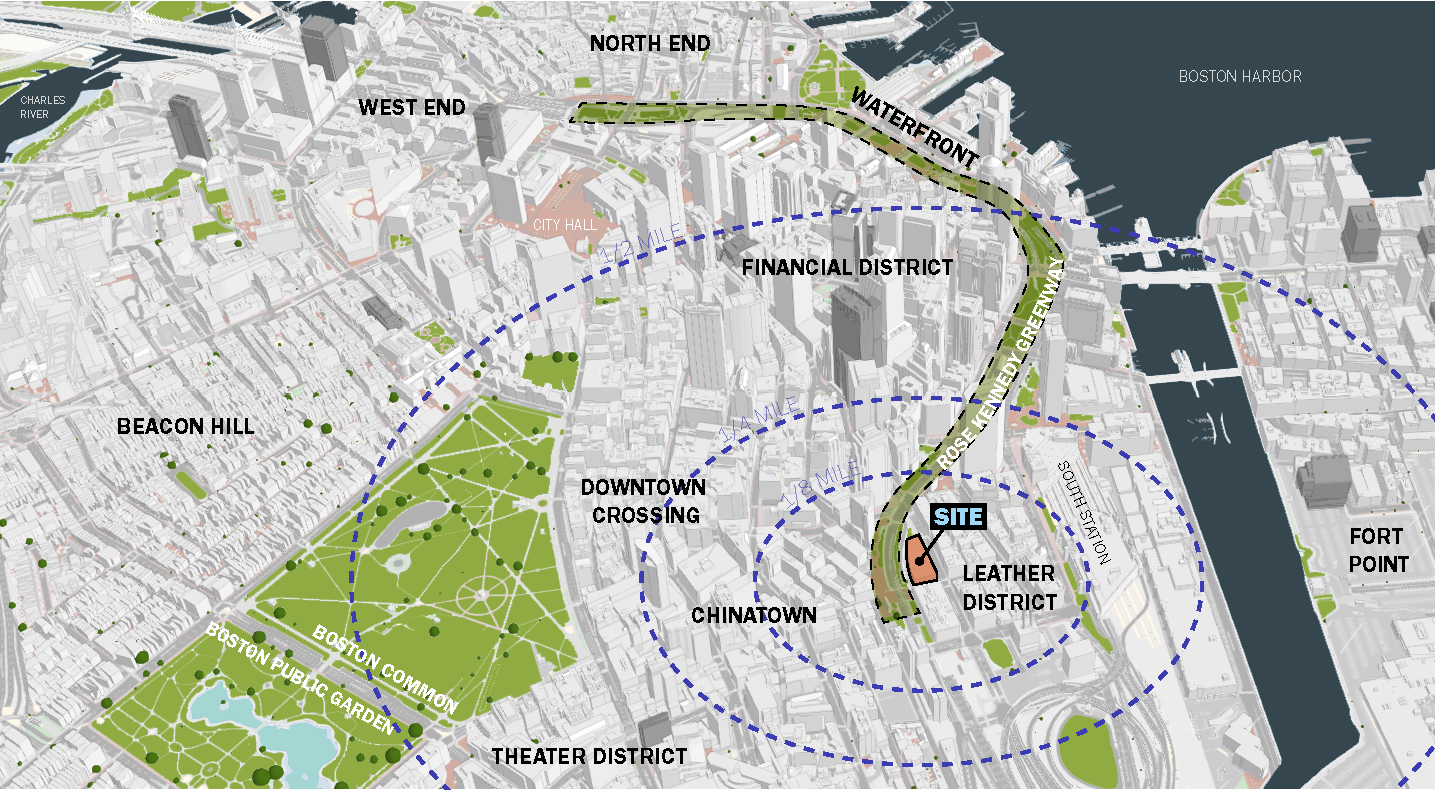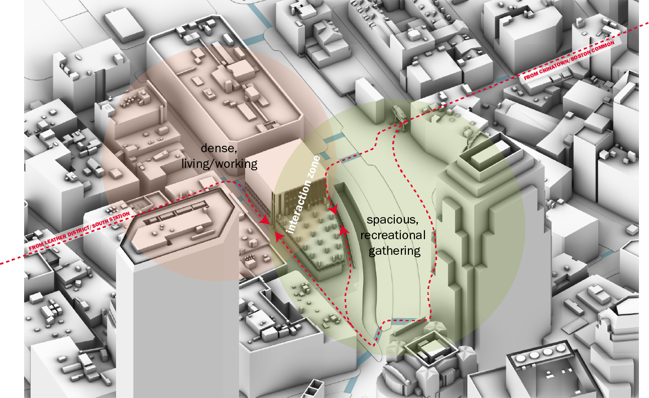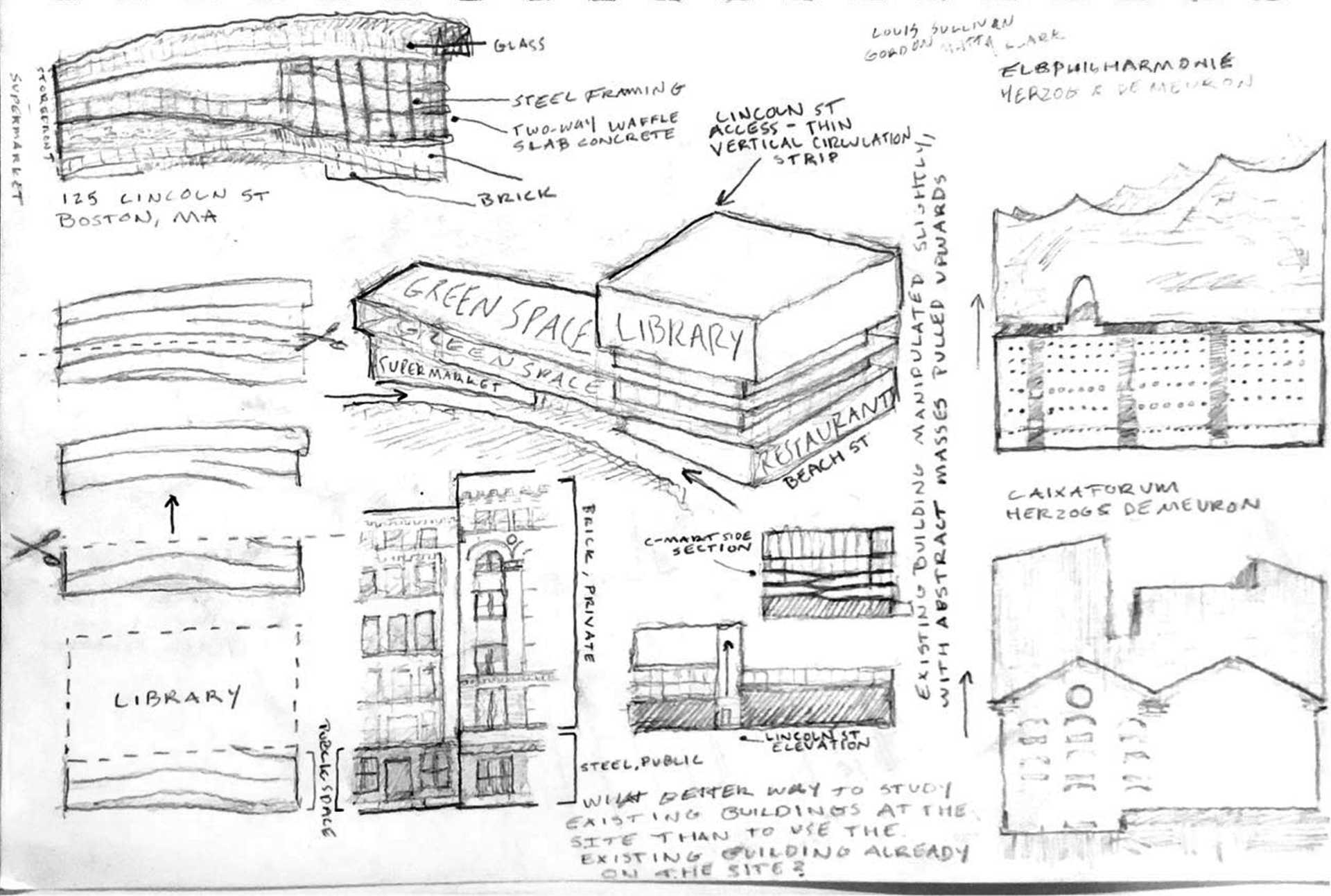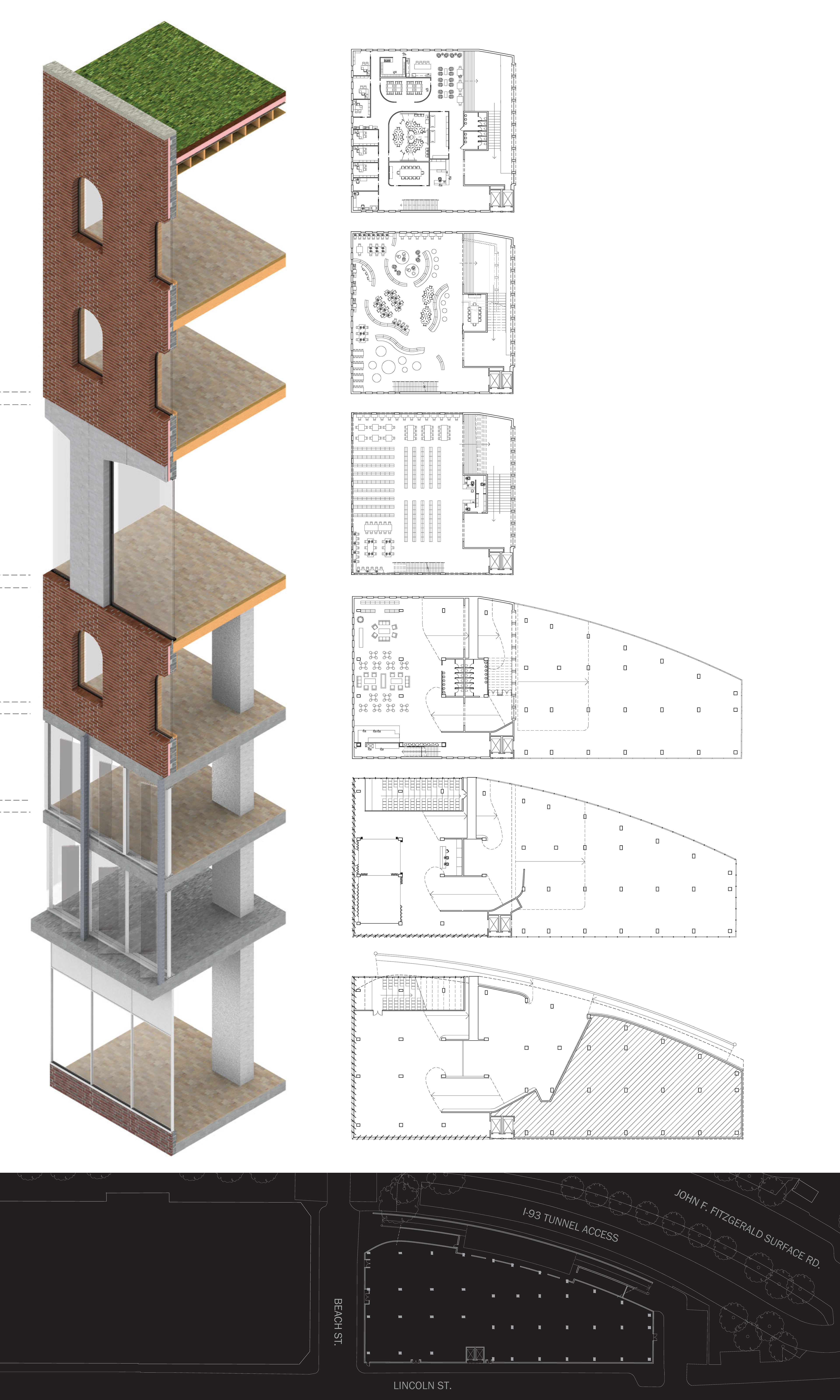 Prompted to design a Boston Public Library branch on the border of Chinatown and the Leather District, I began with an analysis of the site surrounding the parking garage at 125 Lincoln Street. Located at the end of the Rose Kennedy Greenway and between two distinctly differing spaces, the BPL could serve as a cap to the extensive Greenway and connect the districts through a grand public interaction zone.