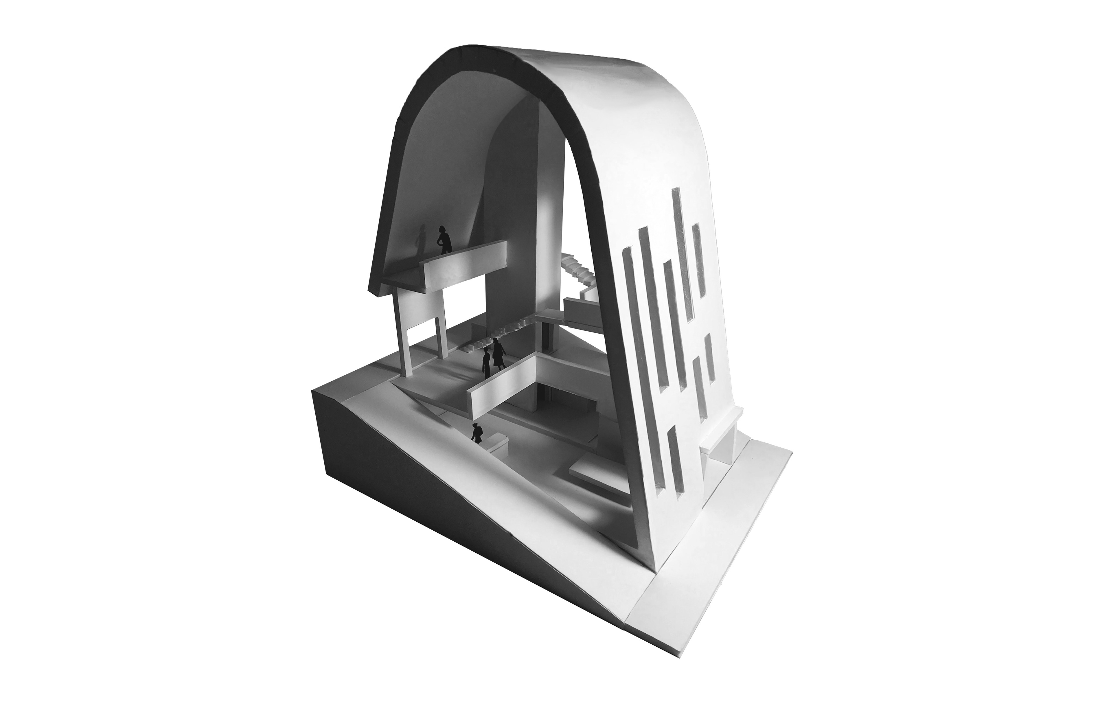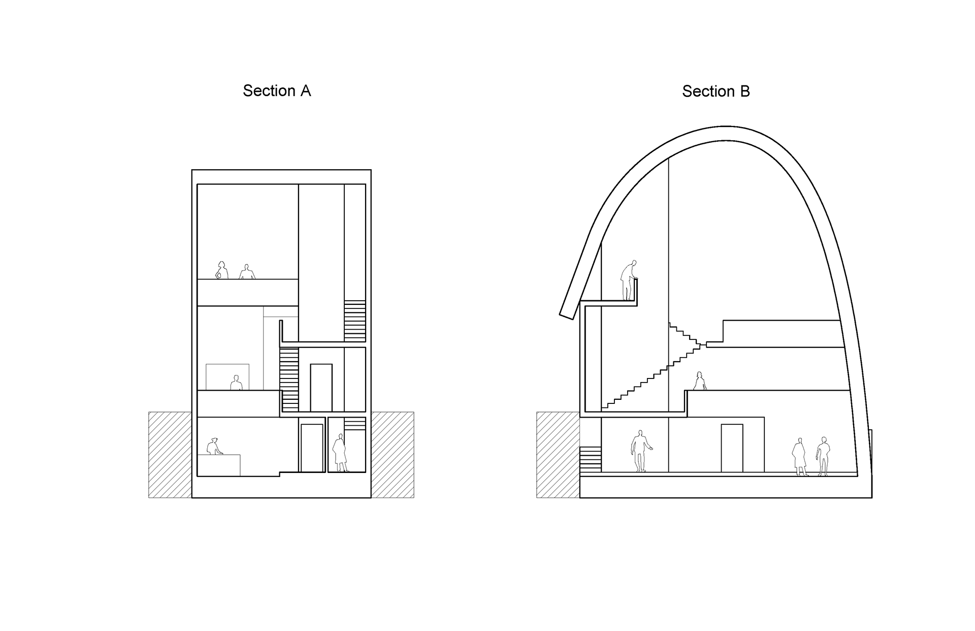 Using a curved building envelope, the spaces that require the highest ceilings are dramatized, while the spaces that are functional with lower ceilings are grouped in and around the building's vertical core. For example, the single-height kitchen adjacent to the core differs drastically from the quadruple-height dining room, which also receives much more light and serves as the building's centerpiece.