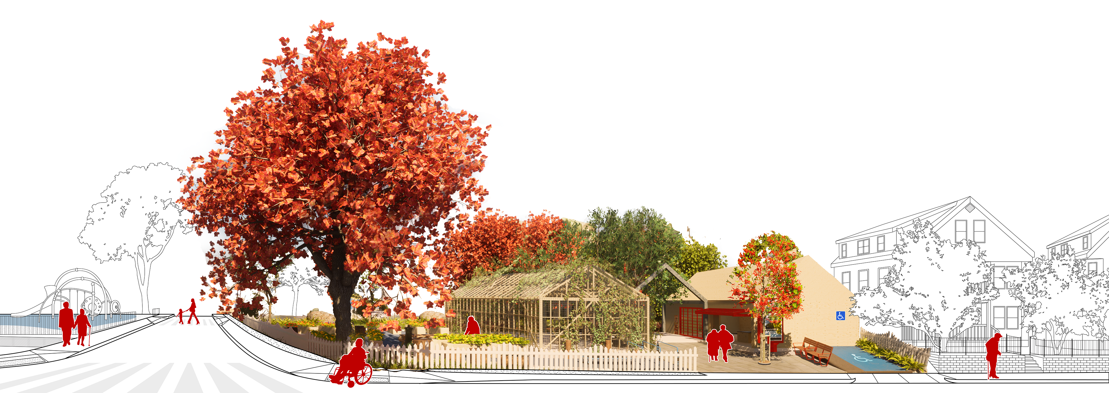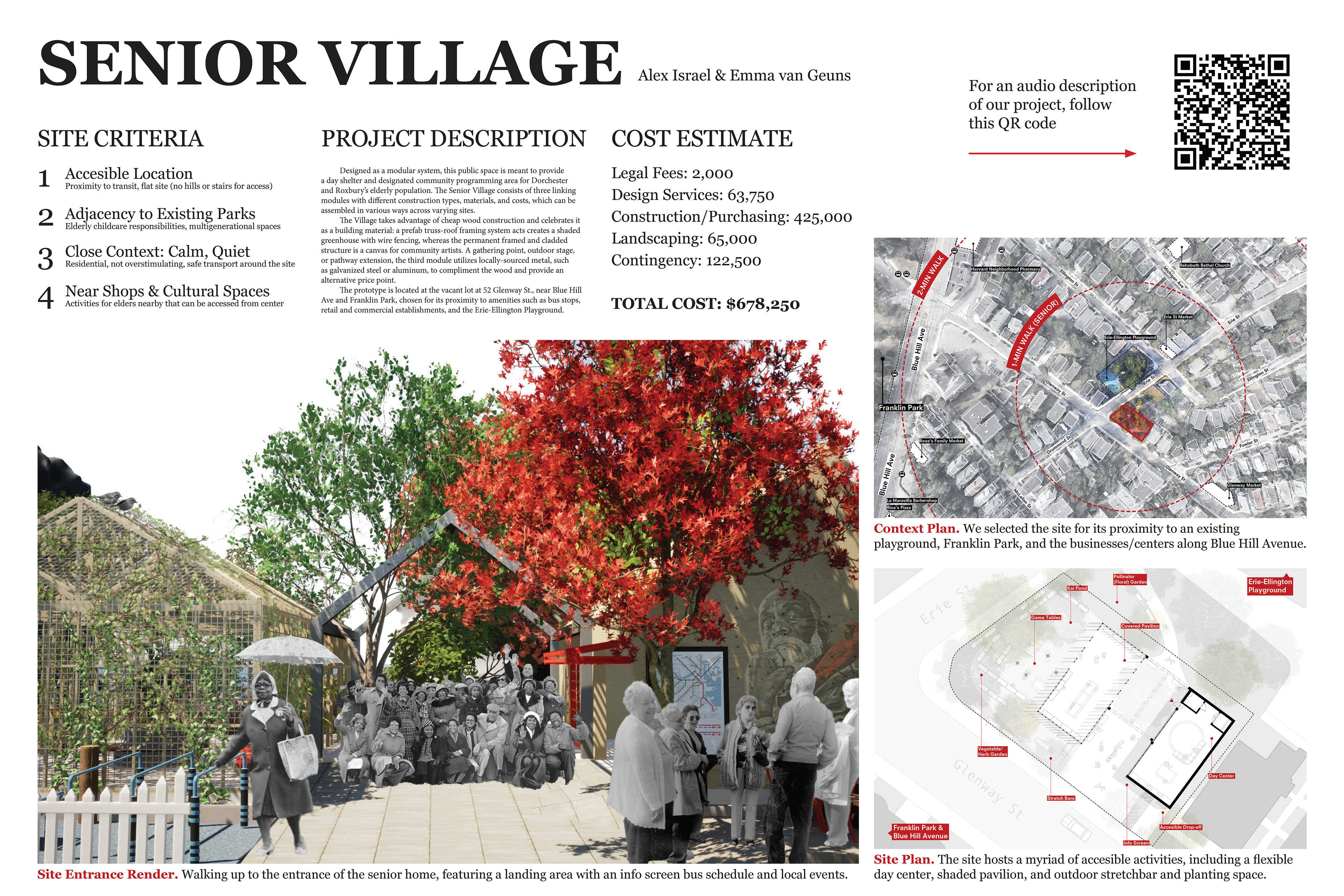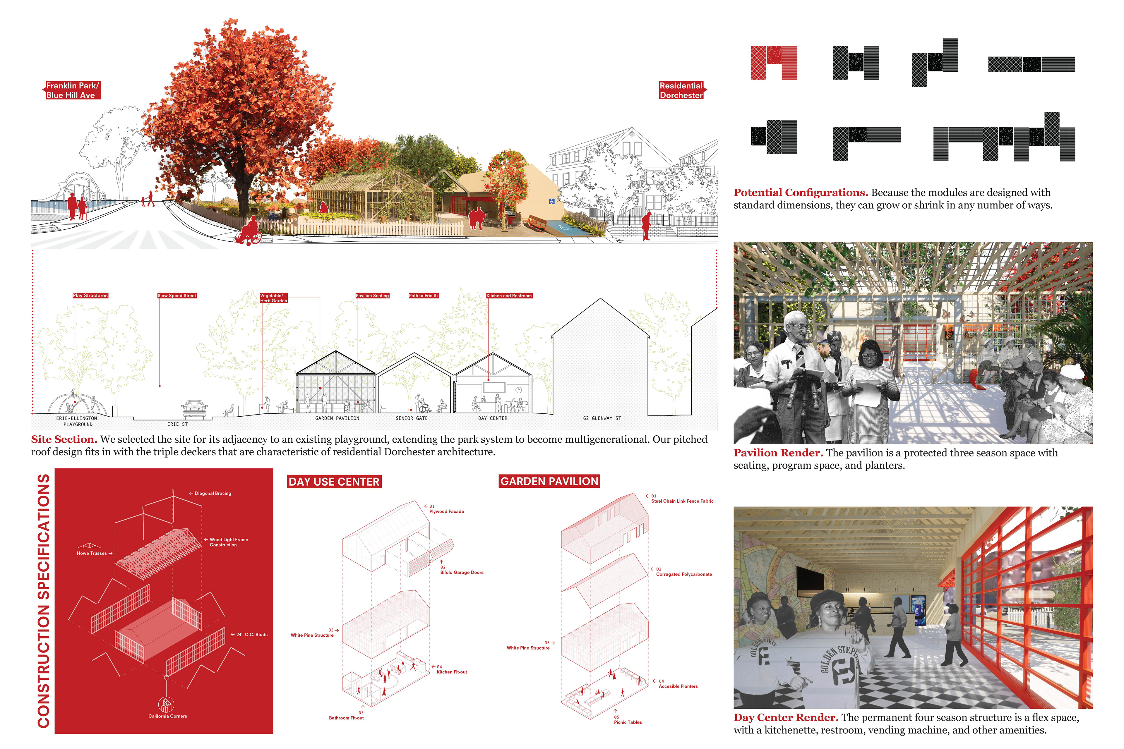 Designed as a modular system, this public space is meant to provide a day shelter and designated community programming area for Dorchester and Roxbury's elderly population. The Senior Village consists of three linking modules with different construction types, materials, and costs, which can be assembled in various ways across varying sites.