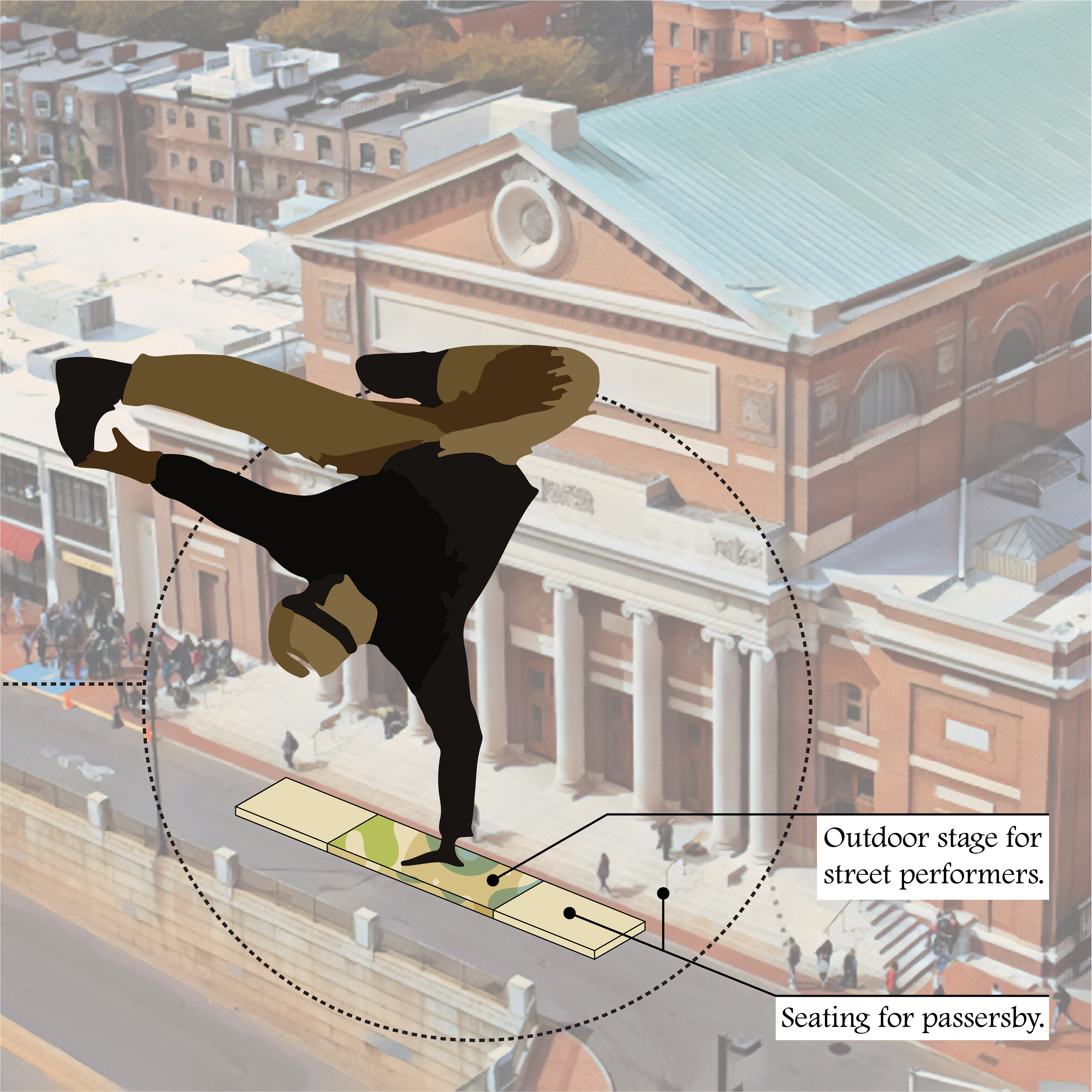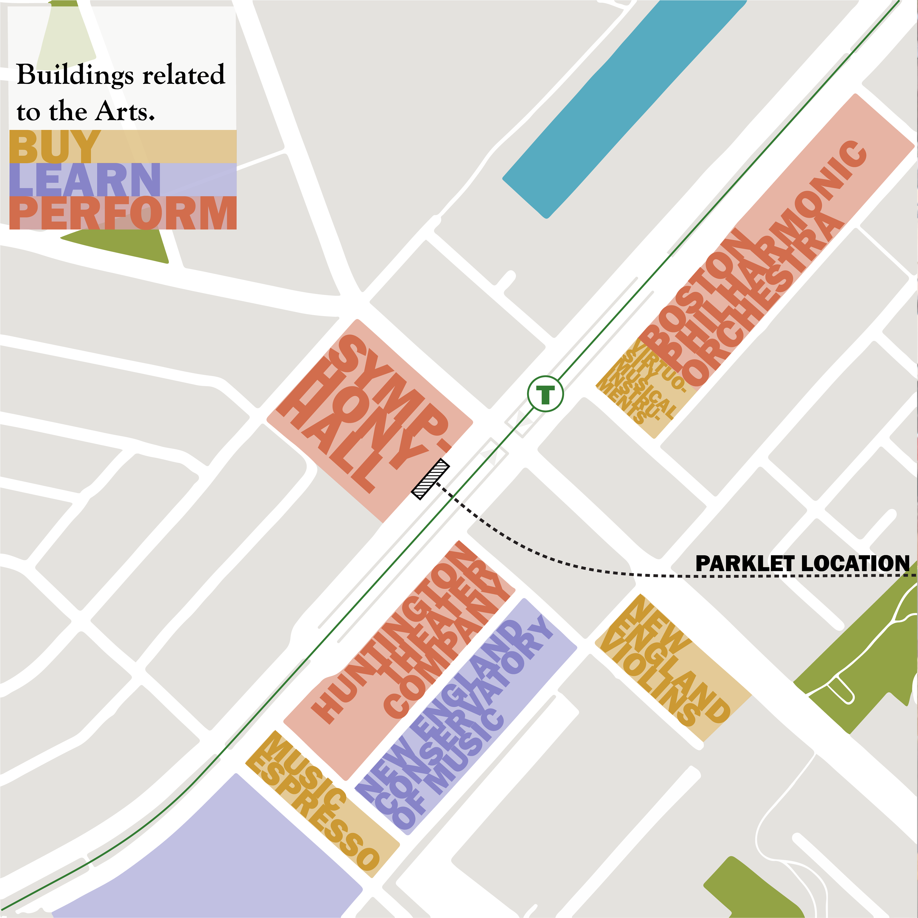 The Symphony Busking Parklet is a response to an AIAS and Vectorworks design competition calling for proposals to enhance the streetscape through an innovative, dimensionally accurate parklet. Located in the Symphony area in Boston, this pop-up performing pod is meant to provide up-and-coming street performers with a free, public stage to sing, dance, play, or create. The parklet's location, in the center of Boston's most musical area, is a great spot for budding talents to get discovered. Bright, playful colors lure pedestrians to watch, while shaded seating entices viewers to stay. The stairs leading up to Symphony Hall, directly across from the parklet, serve as extra seating when the performer attracts a crowd. Foot traffic is supplemented by the nearby Symphony green line station, in addition to the retail on Huntington Ave. and the residential areas of the South End, Back Bay, Fenway, and Northeastern University.