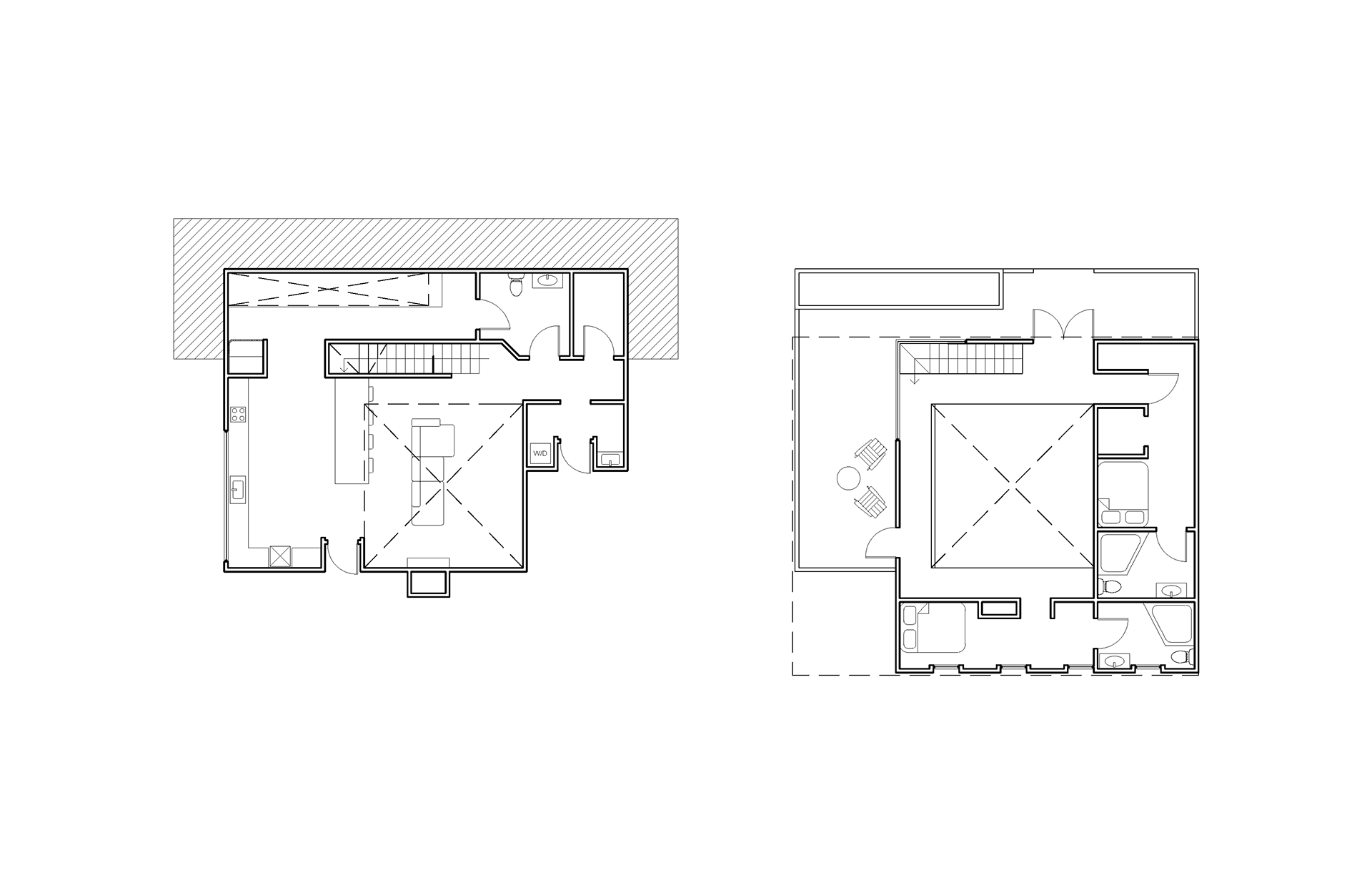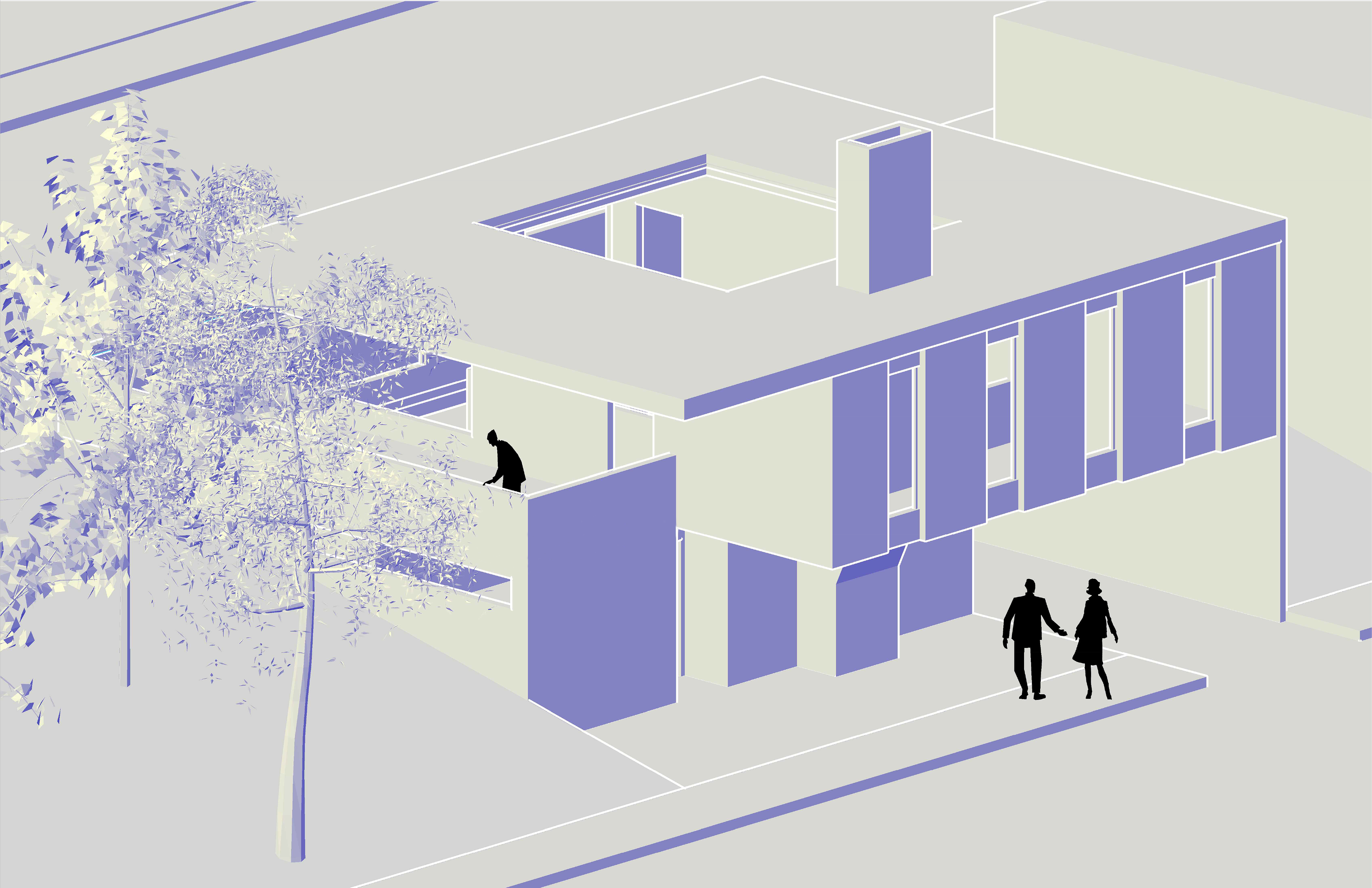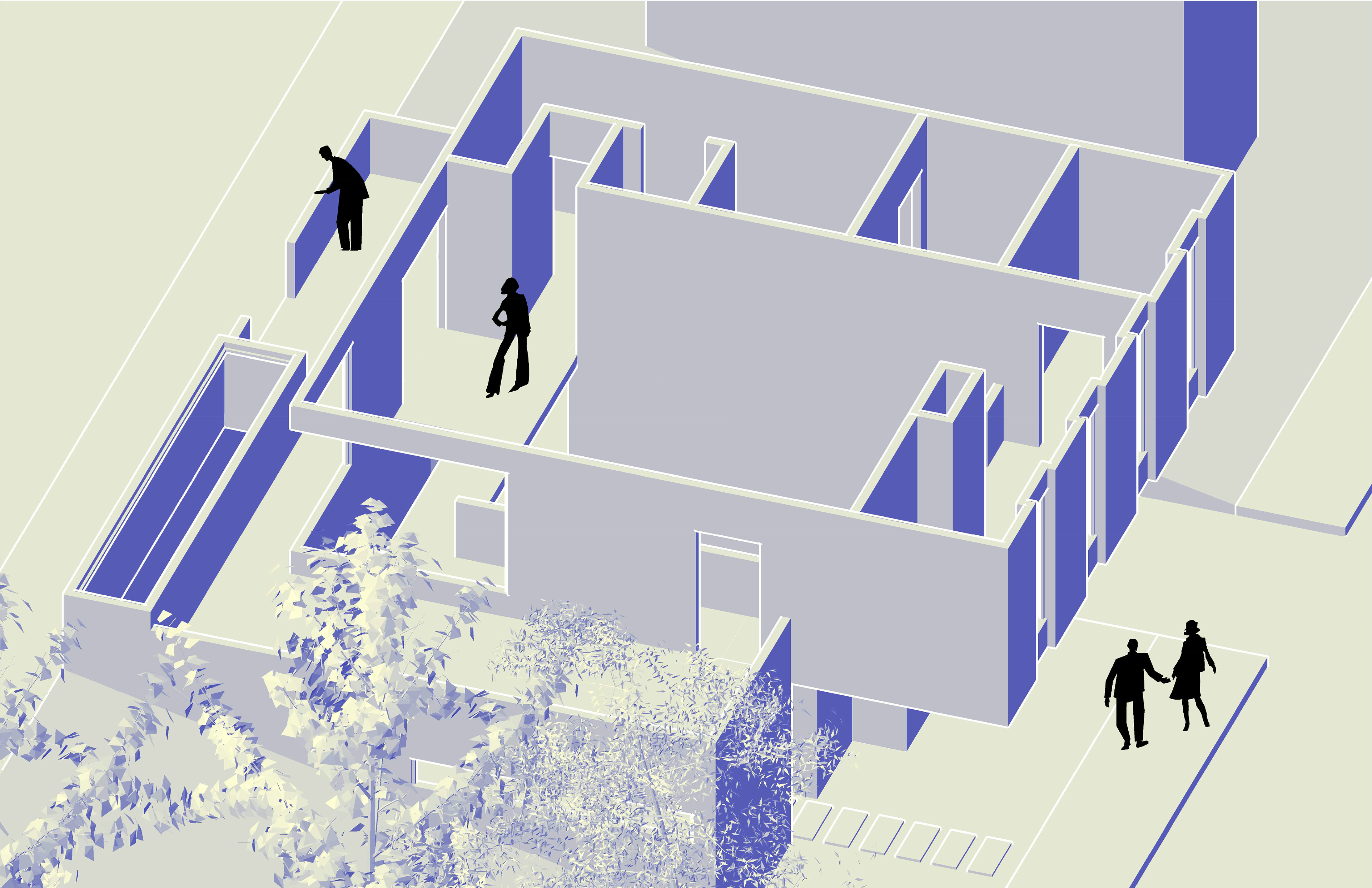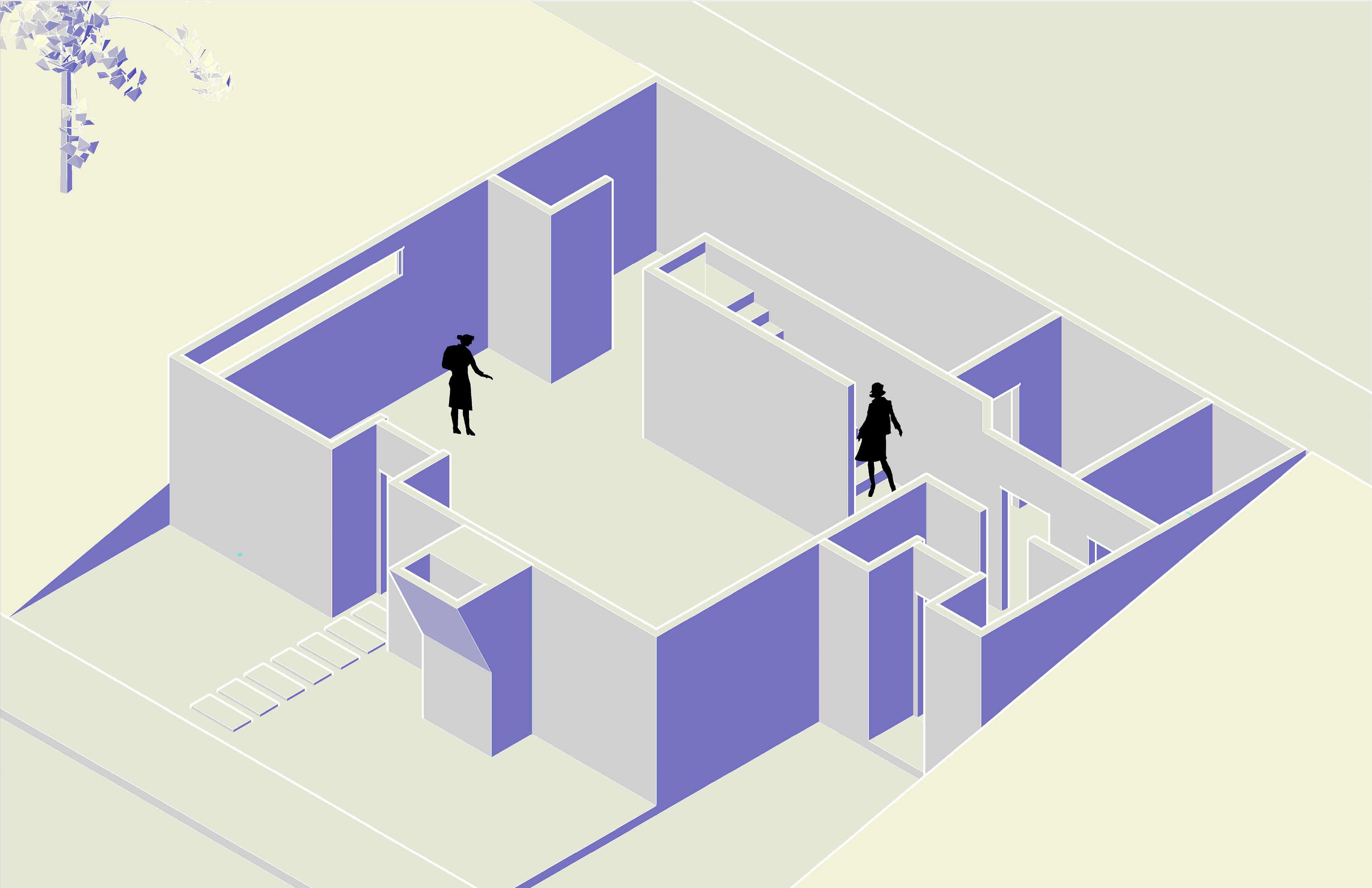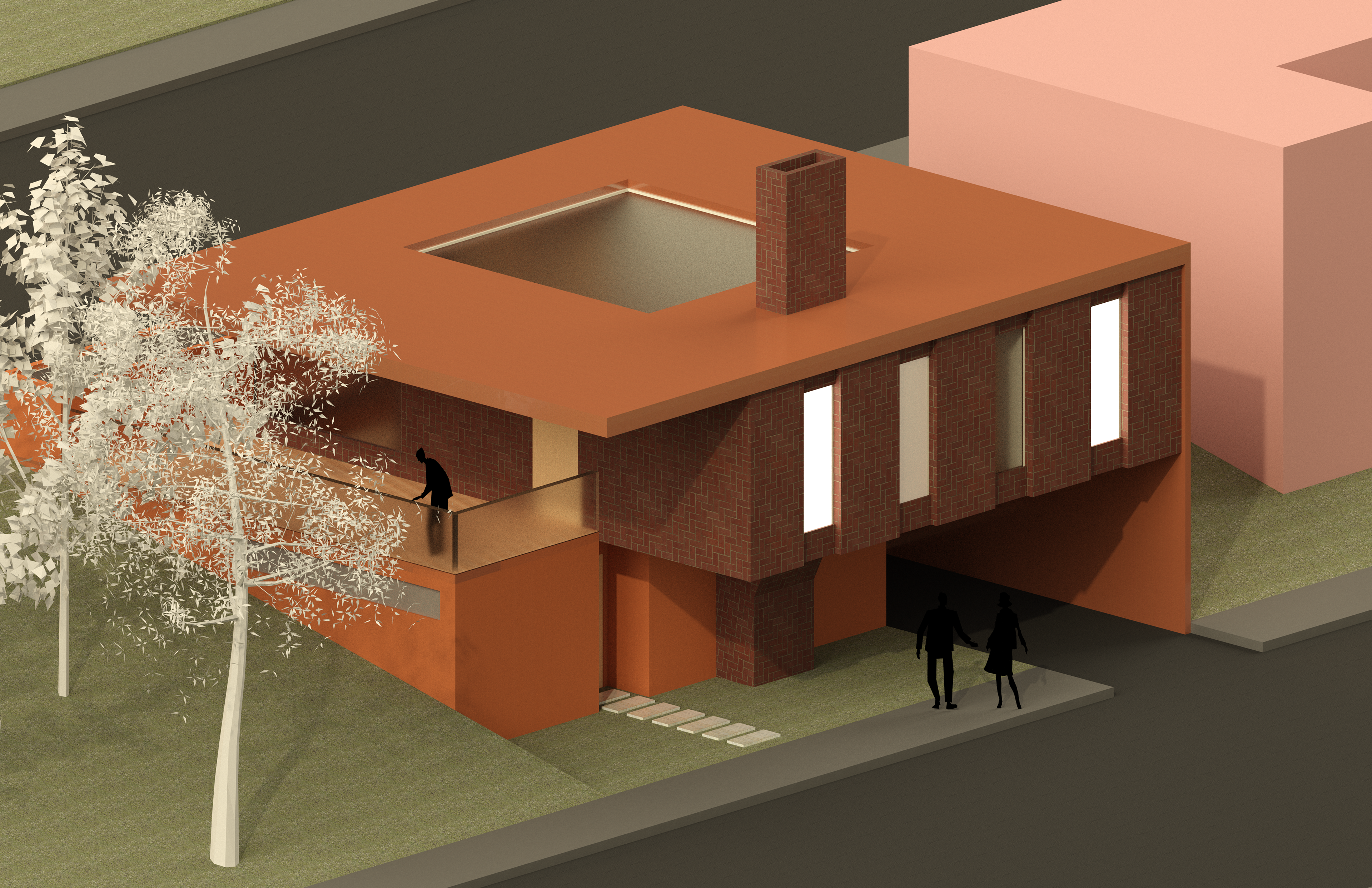 Given a sloping site abutting two roads and neighboring a park on one side and a two-story house on the other, we were tasked with designing a house utilizing the thick/thin tactic.