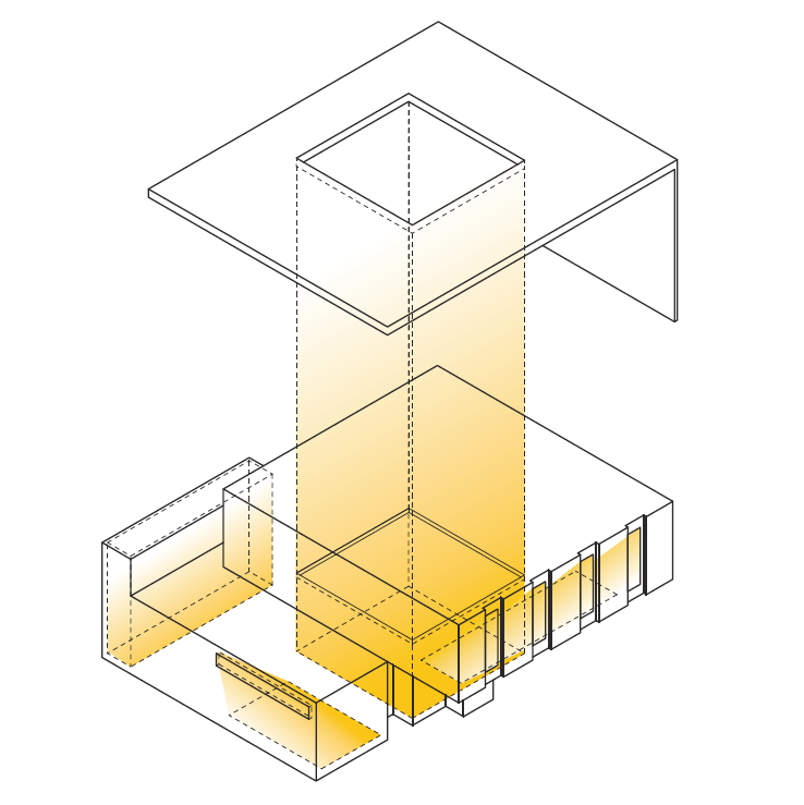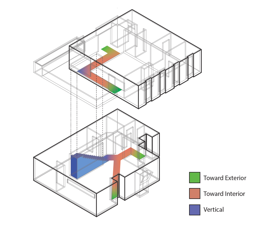 Diagrams show the light protrusion (left) and circulation (right) through the single-family house.